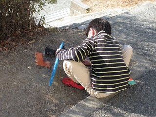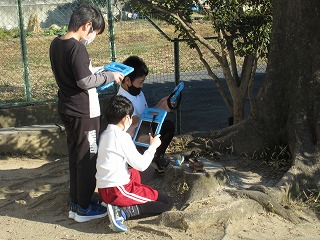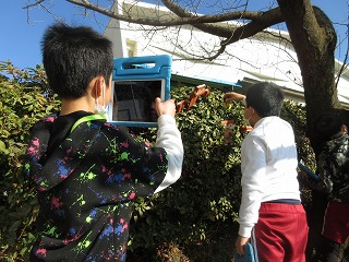 図画工作科で切った木を組み合わせて作品を作りました。自然の中で作品が生きる場所を探してタブレットで写真を撮りました。
