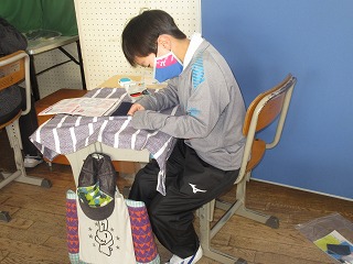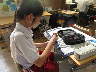 家庭科でエプロンを作っています。ミシンで縫う前に仮縫いをしました。