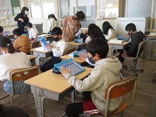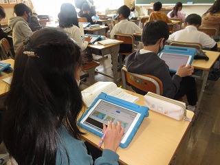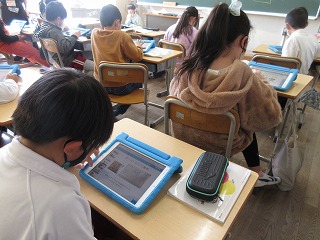 国語科で外国の様子を紹介することを学習しています。タブレットで作成し、友達の紹介文を見ました。