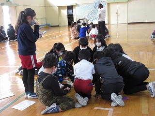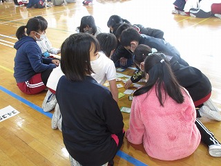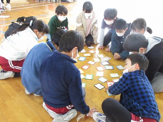 総合的な学習の時間に3年生が若林のよさをかるたにしました。できたかるたを4年生と一緒に取り組みました。