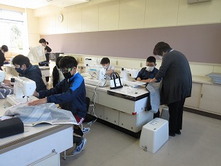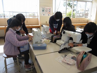 家庭科で地域ボランティアの方に見守っていただき、エプロンを作製しました。