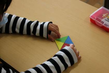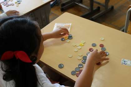 「算数セットにはどんなものがはいっているのかな」〜色板や時計、お金などを使ってみました。