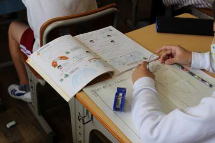 算数の学習で、分度器の使い方を学びました。角をきっちりと合わせて、正確に。