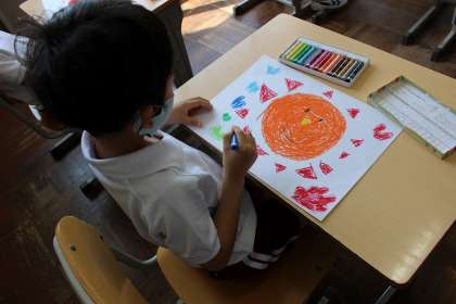 図工の学習では、クレヨンを使ってカラフルな「おひさま」を描きました。
