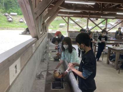 野菜を切ったり、お米をといだり、薪割りが始まりました。