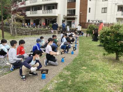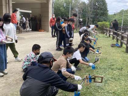 写真たてを作ります。バーナーで焦がした後、磨いて絵を描きます。