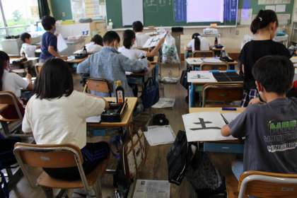習字で「土」という漢字を書きました。丁寧に清書をしていました。