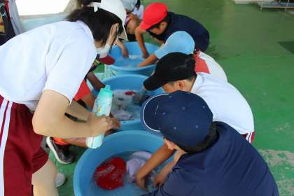 1組は図画工作科で、友達の作品の鑑賞をしました。2組は家庭科で手洗いの学習をし、自分の赤白帽子を洗濯しました。