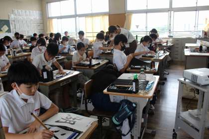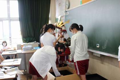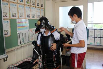 書写の時間には、漢字の組み立てや大きさに気を付けながら「湖」を書きました。社会の学習では、鎌倉時代と戦国時代の鎧を身に付け、違いを実感しました。
