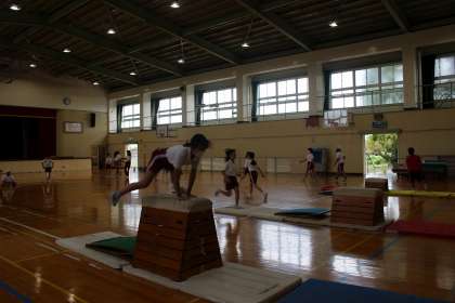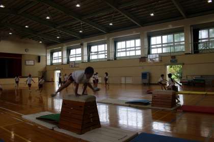 体育の授業で、跳び箱の練習をしました。踏切りや手をつく位置などに気を付けながら練習しました。