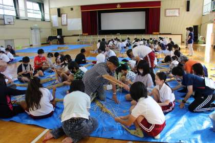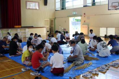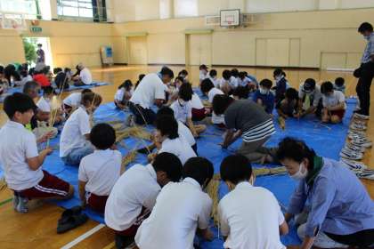 さわやかクラブの皆さんに教えていただきながら、すがい縄づくりをしました。来週の稲刈りに使います。