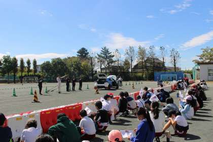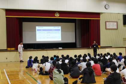 カーボンニュートラルの出前授業では、地球温暖化を防ぐ工夫や水素で走る車について、お話を聞きました。ラリーカーのドリフト走行も全校で楽しみました。