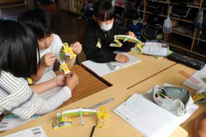 算数の学習では、手作りの天秤を使って重さ調べをしたり、量りの読み方を学んだりしました。理科の時間には、日光の学習の中で影ふみをしました。