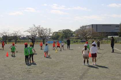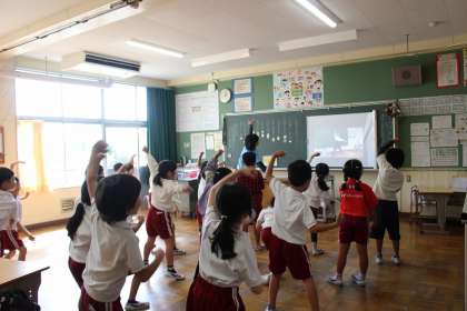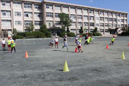 2時間目にグランパスボールクリニックを行いました。ボールを持って走ったり、転がしたりした後、ミニゲームも行いました。運動会の踊りの練習が始まりました。