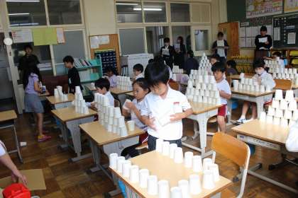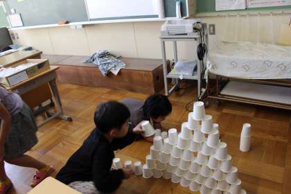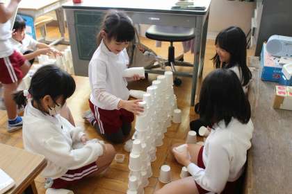 図工「いっぱいつかってなにしよう」では、紙コップやゼリーカップを並べたり積んだりして、造形遊びを楽しみました。