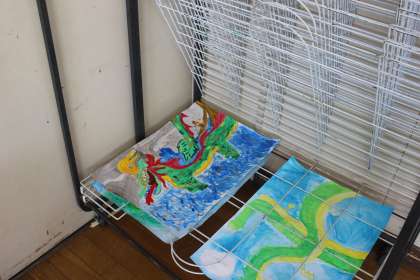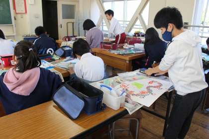 図工の時間には、読書感想画「りゅうの目のなみだ」の色塗りをしました。