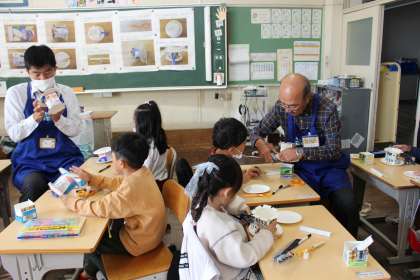 ものづくりサポートセンターの方に教えていただきながら、コトコト車と牛乳パックダーツを作りました。
