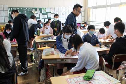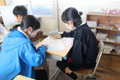外国語の時間には、食べ物などの単語を使って「ドンじゃんけんゲーム」をしました。