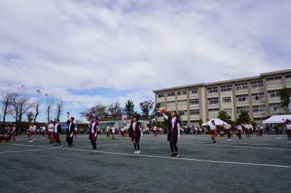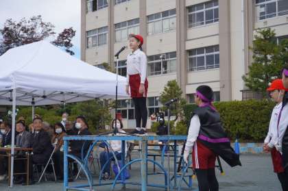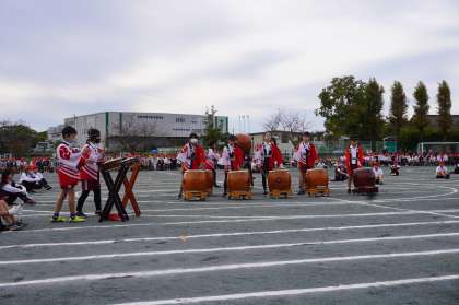 運動会の開会式では、太鼓クラブの発表や6年生からのエールで全校のやる気が高まりました。