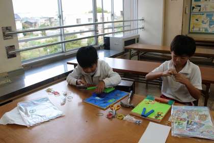 図工「くぎうちトントン」では、木に木々を打ちながら作品のイメージを広げていきました。