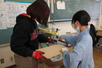 図工の時間には、糸のこぎりの使い方を学び、下絵の線に沿って板を切りました。