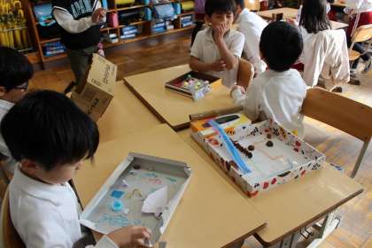 秋見つけで拾ったドングリを使っておもちゃ作りをし、友達と一緒に遊びました。
