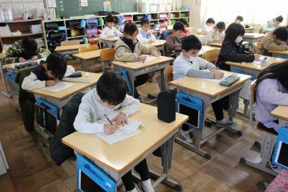 書写の時間には、書き初めの練習をしました。お手本を見ながら一文字一文字丁寧に書きました。