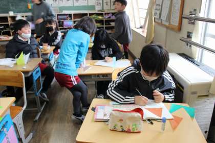 算数の時間には、折り紙を使って三角形や四角形をつくり、形の特徴を調べました。