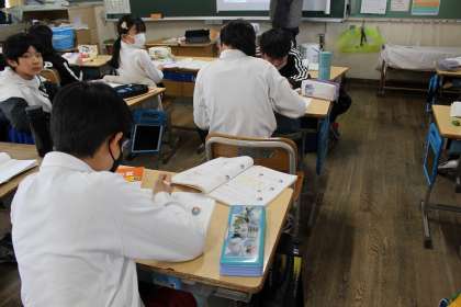 算数の学習では、少数のわり算の筆算を割り切れるまで計算しました。体育の時間には、ミニサッカーゲームをしました。