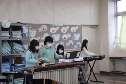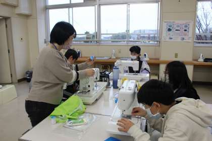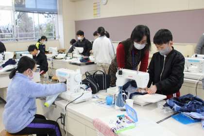 音楽の時間には、グループで選んだ曲の合奏練習をしました。家庭科では、ボランティアの方に教えていただきながらエプロン作りをしました。