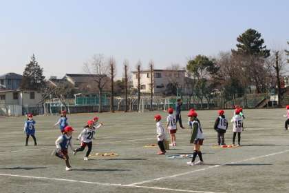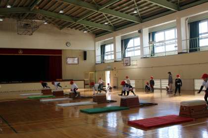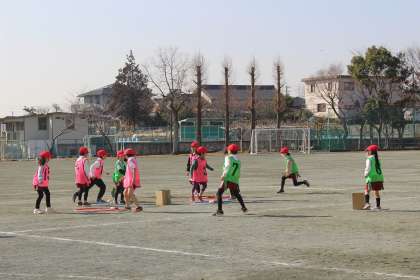 体育の時間には、とび箱の練習をしたり、ドロケイとタグラグビーを組み合わせたゲームをしたりしました。