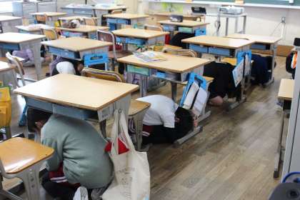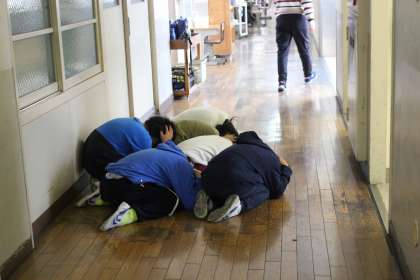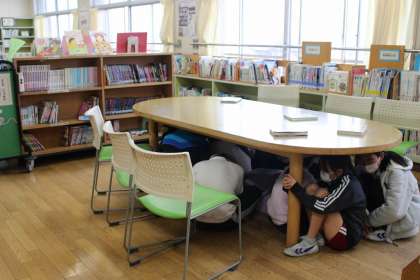 昼放課に、地震を想定した避難訓練を行いました。廊下ではダンゴムシのポーズを、教室や特別教室では机の下にもぐり、頭を守りました。静かに落ち着いて一時避難をすることができました。