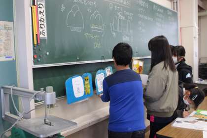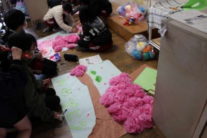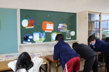 図工の時間には、完成したメッセージボードの鑑賞会を行いました。友達の作品のよさを見つけることができました。6年生の卒業を祝う掲示物づくりを進めています。
