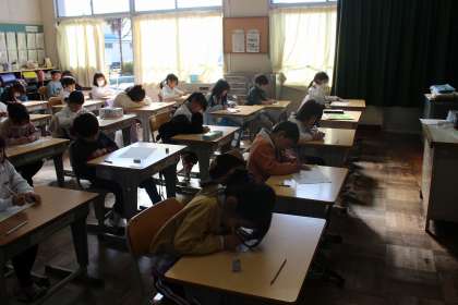 月例テストを行いました。勉強の成果を発揮できました。6年生に送る垂れ幕のメッセージをみんなで考えました。