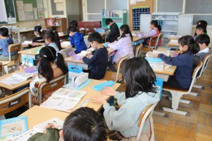 算数の学習では、数図ブロックを使って「おおいほう すくないほう」の数比べをしました。