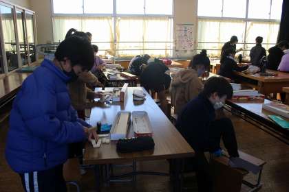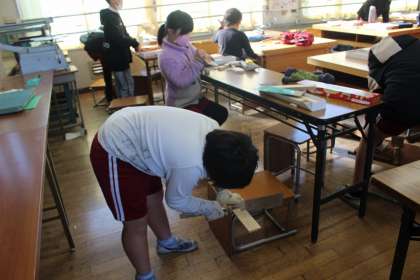 図工の時間には、木材を切り、組み合わせて好きな生き物を作りました。