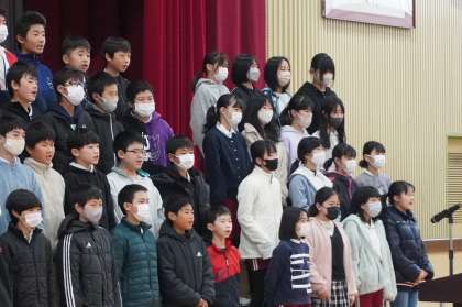 体育館で初めて全校そろっての朝会を行いました。表彰伝達やあいあい週間のお知らせ、6年生の歌の発表などを行いました。