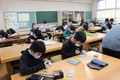 図工の時間には、消しゴムハンコの制作を進めています。学級レクリエーションでは、グループ対抗ゲームで盛り上がりました。図工の作品を入れるバックに好きな絵をかきました。