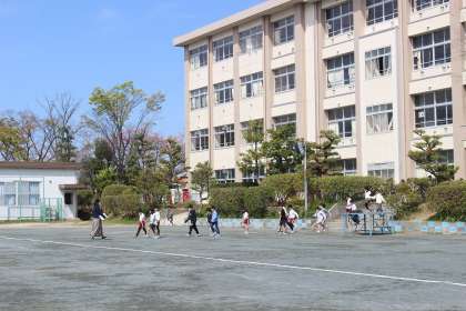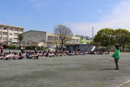 地震による火災を想定し、避難訓練をしました。「おはしも」のルールを守り、速やかに避難場所に集まることができました。