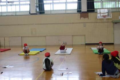 体力テストに向けて、ボール投げの練習をしました。マット運動では、後転のコツについて友達の技を見ながら考え、繰り返し練習しました。