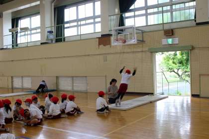 体力テストを実施しました。立ち幅跳びやボール投げ、50m走を行いました。