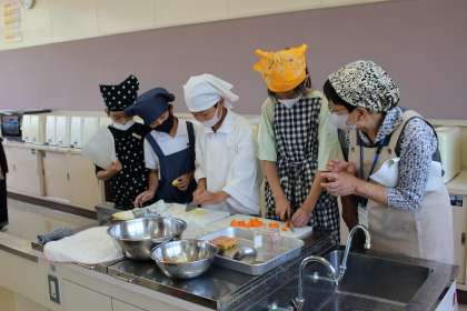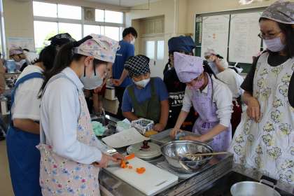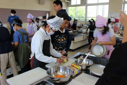 家庭科では、キャンプに向けてカレー作りをしました。手順に沿って、班で協力しながらおいしいカレーを作ることができました。ボランティアの方にも支援していただきました。