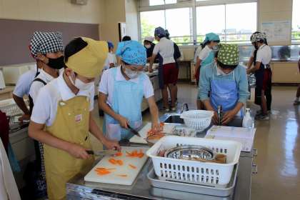 1組が調理実習を行いました。人参、ピーマン、ハムのいろどり炒めを作りました。体育の時間には、50m走のコースを使ってリレーをしました。社会の時間には、日本の様々な課題とその解決方法について、優先順位をつけてグループで話し合いました。