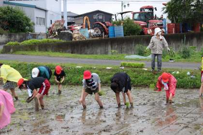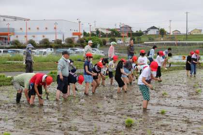 ヤンマーさんの田んぼをお借りして、田植え体験をしました。植え方など、さわやかクラブの皆さんに教えていただきました。