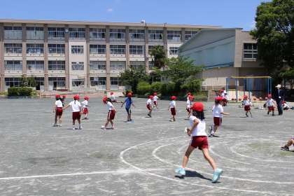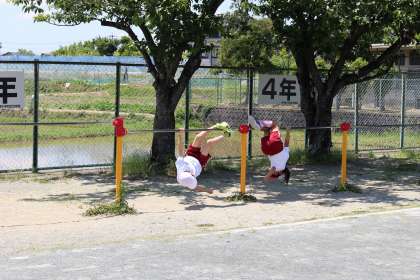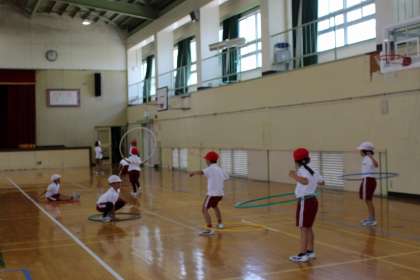 体育の時間には、フラフープをしたり、鉄棒の技に挑戦したりしました。運動場では、いろいろな形の線の上を走る練習をしました。
