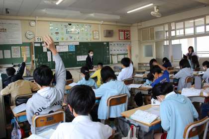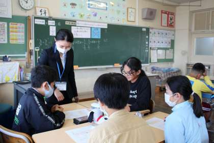 算数の時間には、教育実習生の先生に、分数の積が1になる組み合わせについて授業をしていただきました。