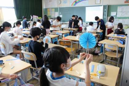 算数の時間には、角度の学習で使う道具を折り紙と箸を使って作りました。
