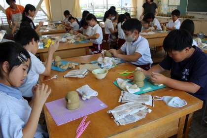 3組がシーサーづくりをしました。顔のパーツを一つ一つ丁寧に作り、オリジナルの飾りつけをして、楽しみながら制作できました。