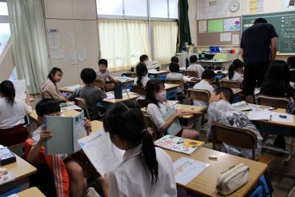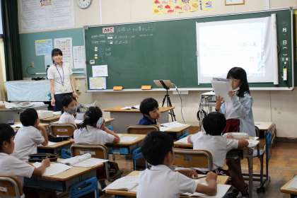 理科の時間には、ゴムの力の大きさを変えると、ものを動かす力はどうなるのかを予想しました。算数の時間には、大きな数を10倍した数について考えました。