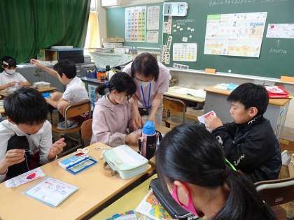 家庭科の時間には、ボランティアの方に教えていただきながら、手縫いの基礎、玉止めの練習をしました。